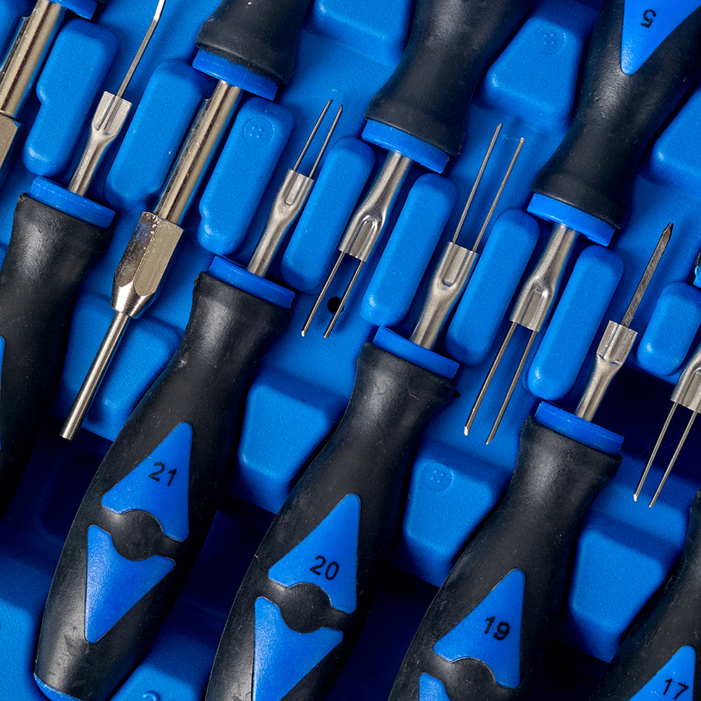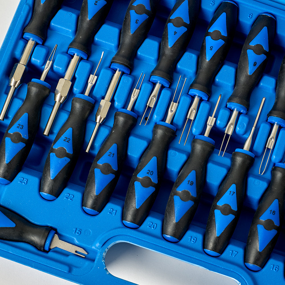 Auto-Connect MQSSET23 er et værktøjssæt, der indeholder 23 forskellige specialværktøjer til at løsne stifter fra originale stik, der bruges i mange forskellige bilmærker. Hvert værktøj er tilpasset specifikke biler eller modeller, hvilket gør det lettere at arbejde med netop det stik, du har brug for.